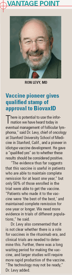 The NCI-funded study enrolled 234 chemotherapy-naive patients with stage III/IV or bulky stage II follicular lymphoma. All patients were treated with PACE chemotherapy (cyclophosphamide, doxorubicin, etoposide, and prednisone), a regimen not commonly used to treat follicular lymphoma. Patients who achieved complete remission for at least six months (n = 117) were randomized to receive BiovaxID or a conventional KLH control vaccine (abstract 2).