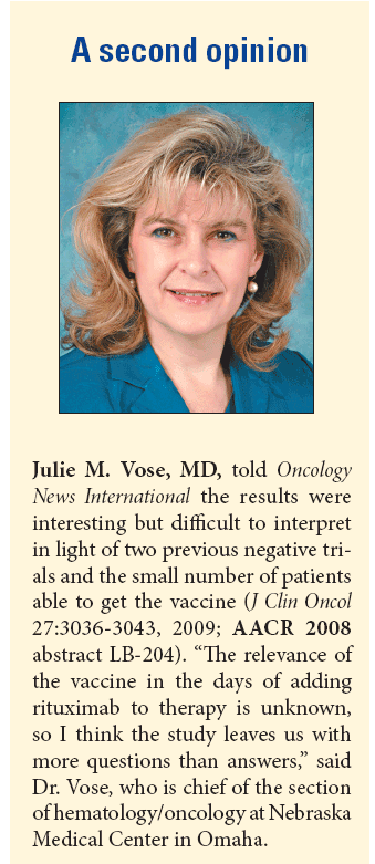The study was initiated using chemotherapy that was standard of care eight years ago. Chemotherapy with rituximab (Rituxan) is the current standard of care. The vaccine induces cellular immunity and therefore has a mechanism of action different from that of other immunotherapies. Theoretically it could be combined with chemotherapy and other immunotherapies.
