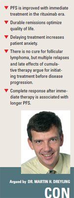 Martin H. Dreyling, MD, from the University Hospital Grosshadern in Munich, argued in favor of early treatment in the majority of asymptomatic patients. In the pre-targeted therapy era, patients with high tumor burden had no difference in OS with immediate or delayed treatment, he said.