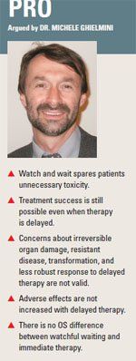 Advantages of waiting include delaying acute and late adverse effects of therapy and delaying impaired fertility. Perhaps the most important point is that there is no survival difference in patients who are managed by watch and wait vs upfront treatment, according to three studies (Semin Hematol 25 (suppl 2):11-16, 1988; J Clin Oncol 15:1110-1117, 1997; Lancet 362:516-522, 2003).