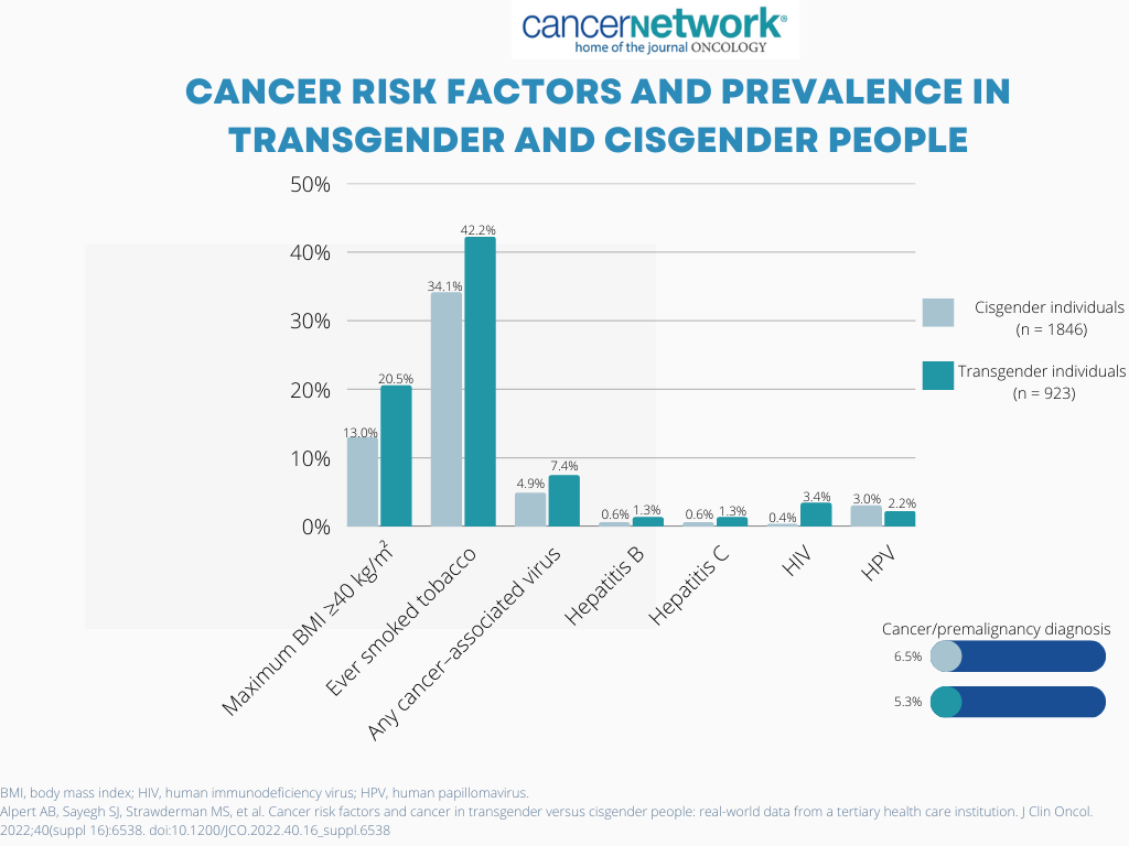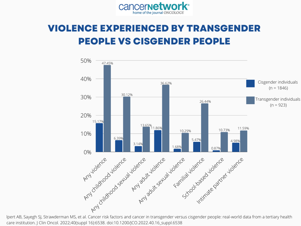 To further assess this, investigators identified 923 transgender patients and 1846 cisgender patients who were matched by age and follow-up time. The investigators then assessed for experiences of violence in both cohorts. From there, it was determined whether there was an association between those experiences and cancer risk factors, such as smoking and a BMI of 40 or more. Compared with cisgender individuals, transgender persons were more likely to encounter violence overall (47.45% vs 15.17%, respectively) as well as childhood (30.12% vs 6.39%) and familial violence (26.44% vs 5.47%).4
