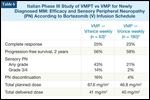Melphalan/prednisone/bortezomib was used in 21 patients (8%) in the CCS and resulted in at least a PR in all but 1 patient (95%). Four of the patients experienced significant toxicity (18%). One recent large phase III study, the VISTA trial, evaluated MP vs MPV in 682 patients with previously untreated MM.[14] Use of the MPV regimen resulted in a PR rate of ≥ 71% and a significant improvement in PFS and OS.[14] Adverse cytogenetics and impaired renal function appeared to have no effect on the efficacy of this melphalan- and bortezomib-based regimen. The MPV regimen was generally well tolerated, but 15% of patients required treatment discontinuation because of toxicity. Grade 1/2 SPN was reported in 31%, and grade 3/4 SPN was reported in 13%.