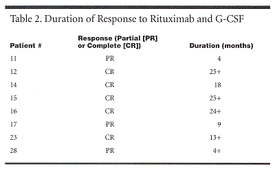 Patients received a total of four weekly intravenous doses of rituximab (375 mg/m2) in combination with a standard subcutaneous dose of G-CSF (5 µg/kg/d), administered for 3 days, starting 2 days before each rituximab infusion.
