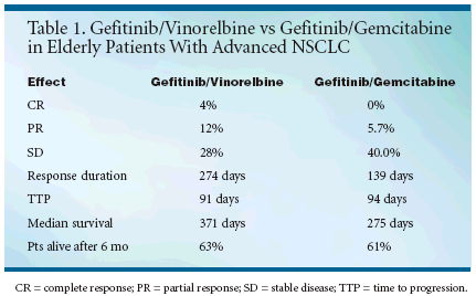 TORINO, Italy-Combinationtherapy with gefitinib (Iressa) andgemcitabine (Gemzar) produced diseasecontrol in 45.7% of elderly patientswith advanced non-small-celllung cancer (NSCLC), according toGiorgio V. Scagliotti, MD, of the Universityof Turin, Torino, Italy, reportingresults of a phase II Italianmulticenter study (abstract 7081). Thestudy also found that patients werebetter able to tolerate gefitinib/gemcitabinethan a gefitinib/vinorelbine(Navelbine) combination.The study included 59 elderly patientswith chemonaive stage IIIB/IVNSCLC. All patients were treated withgefitinib (250 mg/day orally until progression),plus either vinorelbine(30 mg/m2 IV, arm A) or gemcitabine(1,200 mg/m2 IV, arm B). For unexplainedreasons, the two study armsdiffered in a number of characteristics.Male patients accounted for 58%of arm A vs 80% of arm B, and squamoushistology characterized 17% ofarm A vs 31% of arm B.