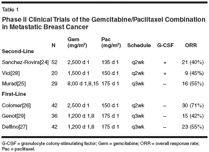 The combination was generally well tolerated, particularly in the firstline setting. In the study by Sanchez- Rovira et al[24] assessing second- or third-line gemcitabine/paclitaxel, 15% of patients had grade 3 or 4 hematologic toxicity, and 34% required granulocyte colony-stimulating factor (G-CSF [Neupogen]) support. Murad et al[25] observed grade 3 or 4 neutropenia in 35% of patients, neutropenic fever in 7%, and neuropathy in 7%. Colomer et al[26] observed grade 4 neutropenia in 17% of patients. Nonhematologic toxicities occurred in less than 5% of cases, except for elevated liver enzyme levels (8%). Preliminary reports by Delfino et al, Vici et al, and Genot et al, presented at the American Society of Clinical Oncology (ASCO) annual meeting in 2002, showed manageable toxicities.[27-30] Colomer at al also observed that patients with elevated levels of circulating HER2 extracellular domain (ECD) had poorer response to therapy (83% vs 42%, P = .02). This finding confirmed results of an earlier study[26,31] and is the basis for a subsequent phase II clinical trial of gemcitabine and paclitaxel plus trastuzumab (Herceptin) in HER2 ECDpositive patients. In addition, interesting pharmacogenomics studies are being performed in patients with primary breast cancer who are receiving neoadjuvant treatment with the gemcitabine/paclitaxel combination.[ 32]