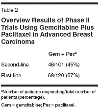 Patients with metastatic breast cancer who receive combination chemotherapy have improved relapse-free and overall survival rates,[1-5] and some have long-term remissions.[6] Currently, patients with early breast cancer commonly receive adjuvant therapy, which includes anthracyclines in cases of high risk of relapse.[7] Although anthracycline-related cumulative toxicities can often be avoided, strong biologic[8] and clinical[9-11] data show that patients with metastatic disease previously treated with anthracyclines in earlier disease stages have a worse prognosis and lower chance of benefit from anthracycline-containing regimens than do chemotherapynaive patients. Therefore, alternative chemotherapies are needed for advanced breast cancer, among which are combinations of taxanes with newer agents such as gemcitabine (Gemzar). The taxanes, either as single agents or combined with other drugs, have become the standard front-line therapy for patients whose disease progresses after anthracycline chemotherapy. The combination of paclitaxel and doxorubicin has been shown to be less active in patients who have previously received adjuvant anthracycline treatment.[11] There is a clear need for active combinations that do not include anthracyclines in this population. Appeal of Combination Therapy Gemcitabine is a cytosine arabinoside prodrug analog with activity in a wide range of tumors. Cytotoxicity of this agent is related to the cellular accumulation of gemcitabine triphosphate (dFdCTP), inducing a G0/G1 and S phase arrest in human solid tumor cells.[12] Single-agent gemcitabine induced response rates ranging from 15% to 46% in breast cancer patients,[13] with minimal toxicity, even in heavily pretreated patients.[ 14] Paclitaxel acts by stabilizing microtubules, blocking eukaryotic cells in the G2/M mitotic phase.[15] When administered on a weekly or every-3- week schedule, paclitaxel has been shown to be among the most active therapies for breast cancer.[16,17] In randomized clinical trials, paclitaxel was equal in efficacy to CMFP (cyclophosphamide [Cytoxan, Neosar], methotrexate, fluorouracil [5-FU], prednisone) in patients with advanced breast cancer.[18] In randomized trials involving anthracycline-naive patients, results with paclitaxel combined with anthracyclines were equivalent[ 19] or superior[3] to those achieved with standard cyclophosphamide, doxorubicin, and 5-FU. Use of gemcitabine combined with paclitaxel is particularly appealing because the drugs have different mechanisms of action and nonoverlapping toxicities. In vivo, paclitaxel increases the accumulation of dFdCTP.[20] In non-small-cell lung cancer cell lines, paclitaxel administered immediately before gemcitabine significantly increased the accumulation of dFdCTP, the incorporation of gemcitabine into RNA, and the apoptotic index.[21] In the mouse model, the greatest delay in tumor growth was obtained when paclitaxel was administered on days 1 and 15, with gemcitabine given every 3 days.[22] In addition to the well-established days 1 and 8 schedules, the paclitaxel/ gemcitabine combination was also evaluated in a phase I study using an every-2-week schedule.[23] Paclitaxel was infused over 3 hours, followed by gemcitabine as a 30- to 60-minute infusion. Dose-limiting toxicities were neutropenia and alanine transaminase (SGPT) elevations. Doses recommended for biweekly phase II studies were 150 mg/m2 for paclitaxel plus 3,000 mg/m2 for gemcitabine. Phase II Trials of Gemcitabine With Paclitaxel Six phase II trials have explored the combination of gemcitabine with paclitaxel. Doses, schedules, and response rates are summarized in Table 1. Three trials were performed in patients receiving first-line treatment for metastatic breast cancer, and three trials involved second- or third-line therapy. Administration schedules were every 3 weeks and every 2 weeks (biweekly) in three trials each. Overall response rates ranged from 40% to 71%, with the highest rates observed in studies of chemotherapy-naive patients (responses are summarized in Table 2).