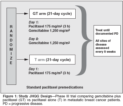 Phase III Trial of Gemcitabine and Paclitaxel Early results of a randomized comparison of gemcitabine/paclitaxel vs paclitaxel alone have been published in abstract form.[33,34] This study compared the combination with paclitaxel in 529 metastatic breast cancer patients previously treated with an anthracycline but no previous chemotherapy for advanced disease. Study objectives were overall survival, progression-free survival, overall response rate, quality of life, pain palliation, toxicity, and time to progressive disease (primary interim analysis objective). The study design is shown in Figure 1. Results for the multicenter JHQG trial presented by O'Shaughnessy at the ASCO annual meeting in 2003 favored the gemcitabine/paclitaxel combination (n = 267) over paclitaxel (n = 262).[33] The median time to progression was 5.4 months (95% CI = 4.6-6.1 mo) for gemcitabine/ paclitaxel and 3.5 months (95% CI = 2.9-4.0 mo) for paclitaxel (P = .0013). The hazard ratio of being progression-free at 6 months was 0.734 (95% CI = 0.607-0.889; P = .0015), with an increased probability of ~50% for the combination. The disease progression-free survival was significantly better with gemcitabine/ paclitaxel (P = .0021). The overall response rate was 39.3% (95% CI = 33.5%-45.2%) for gemcitabine/ paclitaxel and 25.6% (95% CI = 20.3%- 30.9%) for paclitaxel (P = .0007). Furthermore, the combination was associated with a trend toward numerical improvements in analgesic level, pain relief, and global quality of life (P = NS). Grade 4 hematologic toxicity (by Common Toxicity Criteria) was more pronounced with gemcitabine/ paclitaxel than with paclitaxel (17.2% vs 6.6% neutropenia, 1.1% vs 0.4% anemia, 0.4% vs 0% thrombocytopenia, 0.4% vs 0% febrile neutropenia). Nonhematologic toxicity was manageable in both arms. There was one toxic death per arm. Conclusions from this study were that gemcitabine plus paclitaxel demonstrated significant efficacy advantages over paclitaxel alone in patients with metastatic breast cancer, and toxicity was as expected and manageable. During the 2004 ASCO annual meeting, Albain et al[34] presented the initial report of overall survival for this study. The overall survival hazard ratio (HR) was 0.775, significantly in favor of gemcitabine plus paclitaxel (P = .018). A statistically significant advantage of gemcitabine plus paclitaxel over paclitaxel was also reported (18.5 months vs 15.8 months, HR = .775, P = .018). One-year survival was significantly increased for the gemcitabine/paclitaxel arm (70.7% vs 60.9%; P = .019), and the HR favoring the combination persisted (Cox regresion) even after adjusting for baseline covariates: 0.740 (P = .006). Thirty-eight percent of patients receiving gemcitabine plus paclitaxel ceased therapy due to disease progression, vs 55% in the paclitaxel arm, and therapy ended due to adverse events in 6.7% of patients receiving gemcitabine plus paclitaxel, vs 5.0% of those in the paclitaxel arm. Thus, the survival advantage reported in this study has definitively established a role for gemcitabine in the treatment of metastatic breast cancer. Triplet Combinations of Gemcitabine and Paclitaxel Plus an Anthracycline The addition of an anthracycline to the gemcitabine/paclitaxel combination in patients with metastatic breast cancer has been explored in phase II trials, with excellent response rates of 90.2% in the neoadjuvant study reported at the European Breast Cancer Conference in 2004 by Gennari et al[35] and 80% achieved by Sanchez-Rovira and colleagues in the metastatic setting[36] and somewhat greater toxicity than observed with gemcitabine/paclitaxel. In the multicenter Italian study by Gennari et al, of the 41 patients who completed the gemcitabine/epirubicin [Ellence]/paclitaxel regimen and underwent surgery, 6 (14.6%) had a pathologic complete response; three were down- graded to negative axillary nodes.[35] Although results of a randomized comparison of GET (gemcitabine/epirubicin/ paclitaxel) vs FEC (5-FU/epirubicin/ cyclophosphamide), presented at the ASCO annual meeting in 2002, did not show a therapeutic advantage for GET in advanced breast cancer,[ 37] these triplet combinations are being explored in the neoadjuvant setting, with impressive response rates reported. [38] Further research from other investigators, expected in the near future, will provide additional information on the use of gemcitabine and taxanes with and without other chemotherapy agents in patients with metastatic breast cancer. Conclusion Gemcitabine and paclitaxel possess activity against metastatic breast cancer, with low toxicity with gemcitabine/ paclitaxel regimens. Phase III data show a clear advantage for gemcitabine plus paclitaxel over paclitaxel alone in parameters such as time to disease progression, overall survival, and objective response. Moreoever, triplet combinations, with an anthracycline being added to gemcitabine/ paclitaxel, are being explored in the metastatic and neoadjuvant settings.