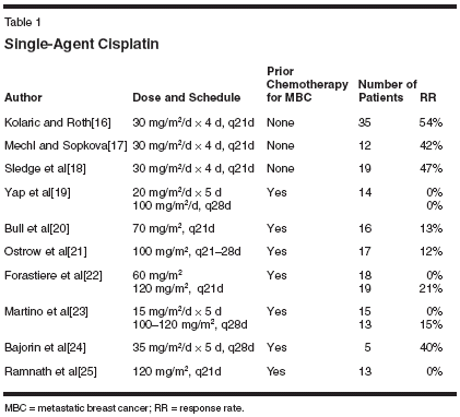 22. Forastiere AA, Hakes TB, Wittes JT, et al: Cisplatin in the treatment of metastatic breast carcinoma: A prospective randomized trial of two dosage schedules. Am J Clin Oncol 5:243-247, 1982.