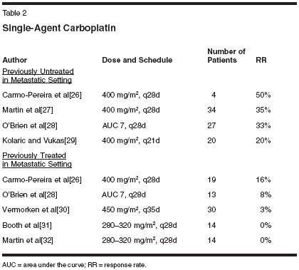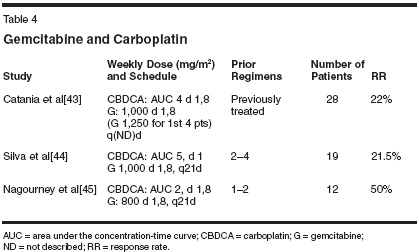 There have been seven phase II trials evaluating the combination of gemcitabine and cisplatin in a total of 210 patients (Table 3).[36-42] Most trials included patients who had received prior chemotherapy. Response rates varied from 26% to 80%. The most common toxicities were neutropenia, thrombocytopenia, anemia, and nausea/vomiting. Nagourney et al[36] published a study on the use of gemcitabine plus cisplatin in relapsed breast cancer. Cisplatin (30 mg/m2) and gemcitabine (1,000 mg/m2) were given on days 1, 8, and 15 of a 28-day cycle. Because of significant toxicity, the regimen was modified after the 12th patient to cisplatin (30 mg/m2) and gemcitabine (750 mg/m2) on days 1 and 8 of a 21- day cycle. This regimen was developed based on this group's prior observations and mechanistic analyses, which indicated that simultaneous or close sequencing of gemcitabine and cisplatin enhanced the synergistic interaction of these two drugs. Of 30 patients, 3 (10%) had a complete response and 12 patients (40%) had a partial response, for an overall response rate of 50%. Of note, two of the responses were seen among the four women who had previously been treated with high-dose/stem cell therapy. The median time to disease progression was 14 weeks for all 30 patients but 23.5 weeks for the patients who had an objective response. The main grade 3/4 toxicities were hematologic: thrombocytopenia in 33%/14% and neutropenia in 11%/ 4%, respectively. Chaudhry and colleagues[37] studied 28 patients for whom prior treatment with anthracyclines and taxanes failed. Women received cisplatin (25 mg/m2) and gemcitabine (1,000 mg/ m2) on days 1, 8, and 15 of a 28-day cycle. One patient (3.6%) had a complete response and 10 patients (35.7%) had a partial response, for a total response rate of 39%. The median duration of response was 21 weeks (range: 14 to 65 weeks). The most common side effects (grade 4) were thrombocytopenia in 12% and neutropenia in 9% of patients. Doroshow and co-workers[38] conducted a phase II study with 55 patients who were divided into those who had zero to one prior regimens (minimally treated group or "M") and those with two or more prior regimens, including doxorubicin or a taxane (heavily treated group or "H"). Cisplatin (25 mg/m2) was given on four sequential days (days 1-4) and gemcitabine (1,000 mg/m2) was given on days 2 and 8 during a 21-day cycle. Granulocyte colony-stimulating factor was given to the heavily pretreated group. In the minimally treated group, two patients had a complete response and seven patients had a partial response, for a response rate of 43%. In the heavily pretreated group, two patients experienced a CR and four patients had a partial response, for a response rate of 26%. The main grade 3/4 toxicities were, again, hematologic; 39 patients developed neutropenia, 38 patients had thrombocytopenia, and 19 patients developed anemia. Burch and the North Central Cancer Treatment Group (NCCTG) [39] performed a phase II study with 20 patients who had received at least one prior anthracycline or taxane-containing chemotherapy regimen either as adjuvant therapy for breast cancer or in the metastatic setting. A two-stage design was used with 20 patients enrolled in the first phase. If more than three responses were seen, a second phase of 30 patients was to be conducted. This report considers the patients entered into the first phase of the trial. Patients received cisplatin (25 mg/m2) and gemcitabine (1,000 mg/m2) on days 1, 8, and 15 of a 28- day cycle. Of 20 patients, 1 had a CR and 5 experienced a PR, for a RR of 29% and a time to disease progression of 7.1 months. Toxicities included neutropenia (38% grade 3, 43% grade 4) and thrombocytopenia (24% grade 3, 38% grade 4). Because of the significant hematologic activity, patients on the second phase of the trial received 800 mg/m2 of gemcitabine and 25 mg/m2 of cisplatin. Galvez and Galmarini[40] reported on 41 women with metastatic breast cancer who had progressed after previous anthracycline therapy. Cisplatin (50 mg/m2) was given on day 1, and gemcitabine (1,200 mg/m2) was delivered on days 1, 8, and 15 of a 28- day cycle. Four women (10%) had a CR and 16 women (39%) had a PR, for an overall RR of 49% and a time to disease progression of 5.2 months. The main grade 3/4 toxicities were hematologic; thrombocytopenia (47%), neutropenia (48%), and anemia (42%) resulted in red cell and platelet transfusion in 35% and 10% of patients, respectively. Calderillo Ruiz and associates[41] evaluated the response to gemcitabine and cisplatin as first-line therapy in 31 patients. Cisplatin (75 mg/m2) was administered on day 2, and gemcitabine (1,200 mg/m2) was given on days 1 and 8 of a 21-day cycle. Four patients had a CR and 21 patients had a PR, for an overall RR of 80%. Grade 3/4 toxicities included neutropenia in 20%, anemia in 2.9%, thrombocytopenia 1.72%, and nausea/vomiting in 16.9% of cycles. de la Pena and collaborators [42] reported their study of 16 patients who had received one to two previous chemotherapy regimens. Cisplatin (75 mg/m2) was given on day 2, and gemcitabine (1,000 mg/m2) was given on days 1 and 8 of a 28-day cycle. Four (25%) patients had a CR and six patients (37.5%) had a PR, for an objective response rate of 62.5%. The median time to disease progression was 11.2 months. Grade 3/4 toxicities included thrombocytopenia in 19.5%, fatigue in 18%, and nausea/vomiting in 12.1%. These seven studies suggest that the synergism observed in vitro with the combination of cisplatin and gemcitabine is borne out by the response rates in this group of previously treated and untreated women with metastatic breast cancer. Without comparison, however, the optimal regimen with the greatest response rate and the least toxicity has yet to be elucidated. Gemcitabine Plus Carboplatin The combination of gemcitabine and carboplatin has also been found to have synergy in vitro. Three trials have recently been reported using t