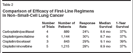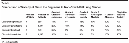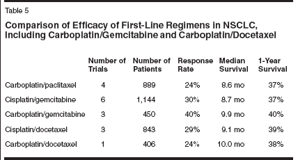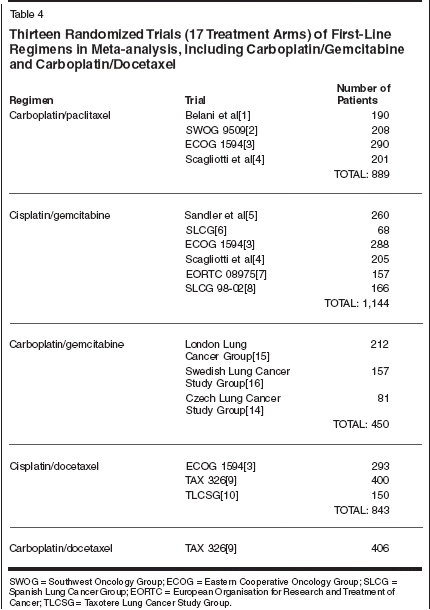 ABSTRACT: Standard first-line chemotherapy regimens in advanced non-smallcelllung cancer (NSCLC) include carboplatin (Paraplatin)/paclitaxel,cisplatin/docetaxel (Taxotere), cisplatin/gemcitabine (Gemzar), andcisplatin/vinorelbine (Navelbine). An informal meta-analysis of 13 randomizedtrials of these regimens in NSCLC indicates no marked differencesin terms of response rates or survival, but toxicity advantageswith cisplatin/gemcitabine and cisplatin/vinorelbine regimens. An informalmeta-analysis to assess the feasibility of substituting carboplatinfor cisplatin in combination with gemcitabine or docetaxel shows nomarked differences in efficacy between cisplatin- and carboplatincontainingregimens, although a slight trend favoring carboplatin/gemcitabine treatment may be observed; comparison of toxicity profilesamong carboplatin-based regimens suggests advantages forcarboplatin/gemcitabine treatment. A formal meta-analysis of 13 trialscomparing gemcitabine/platinum combinations with other platinumbasedregimens in NSCLC indicates significant improvements inprogression-free survival and overall survival with gemcitabine/platinum treatment. On balance, available data suggest that carboplatin/gemcitabine may be the first-line option with the best therapeutic index.