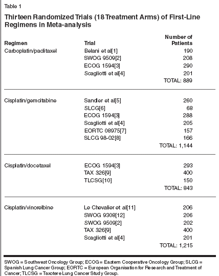 Results of randomized clinicaltrials have established carboplatin(Paraplatin)/paclitaxel,cisplatin/gemcitabine (Gemzar), cisplatin/docetaxel (Taxotere), and cisplatin/vinorelbine (Navelbine) asstandard first-line treatments for advanced/metastatic non-small-cell lungcancer (NSCLC). To address the relativemerits of these regimens, an informalmeta-analysis of efficacy andtoxicity findings in randomized trialsevaluating these regimens was performed.Similarly, an informal meta-analysiswas performed to compare carboplatin-containing regimens withcisplatin-containing regimens to assessthe potential merits of replacingcisplatin with carboplatin in combinationwith gemcitabine or docetaxel.In addition, a formal meta-analysis oftrials comparing gemcitabine/platinumregimens with other platinumbasedregimens in NSCLC has beenperformed with regard to progressionfreesurvival and overall survival.Informal Meta-analysis ofStandard First-Line RegimensOur informal meta-analysis included13 major randomized trials ofcarboplatin/paclitaxel, cisplatin/gemcitabine,cisplatin/docetaxel, or cisplatin/vinorelbine as first-lineregimens in advanced NSCLC; 12 ofthe trials had enrollment greater than150 patients. Select results from thesetrials-consisting of objective responserate, median and 1-year survival,and major toxicities-wereweighted for patient accrual, mathematicallyaveraged, and compared.The 18 treatment arms included in theanalysis are shown in Table 1.[1-12]The comparison of efficacy outcomesis shown in Table 2. Objectiveresponse rates were similar for thefour regimens, ranging from 24% to30%. Survival outcomes also showedlittle difference among regimens, withmedian duration of survival rangingfrom 8.6 to 9.1 months and 1-yearsurvival ranging from 37% to 39%.These findings are consistent withthose reported by Schiller et al in theEastern Cooperative Oncology Group(ECOG) 1594 trial, which showed nosignificant differences in overall survival(and nearly superimposed survivalcurves) with cisplatin/paclitaxel,cisplatin/gemcitabine, cisplatin/docetaxel,and carboplatin/paclitaxel[3]and with the Southwest OncologyGroup comparing carboplatin/paclitaxelto cisplatin/vinorelbine.[2]