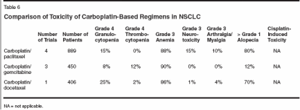 Informal Meta-analysis: CanCarboplatin Replace Cisplatinin Combination WithGemcitabine or Docetaxel?It is unclear whether cisplatin-containingcombinations with docetaxelor gemcitabine are superior to carboplatin-containing combinations. Thefindings of the TAX 326 trial, whichshowed a survival advantage of cisplatin/docetaxel over cisplatin/vinorelbineand no difference in this regardbetween cisplatin/vinorelbine and carboplatin/docetaxel regimens, aresometimes interpreted to indicate anadvantage of cisplatin/docetaxel overcarboplatin/docetaxel.[9] However, anumber of trials have shown no differencebetween cisplatin- and carboplatin-containing regimens, includinga trial comparing cisplatin/gemcitabineand carboplatin/gemcitabine,[14]with many data indicating that carboplatin-containing regimens are bettertolerated.