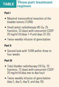 Seven of the nine patients who completed the experimental regimen were cancer-free with intact bladders at a median follow up of 24 months.