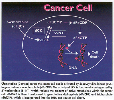 In a third study, researchers found individual variation in the expression of two enzymes that regulate the activity of gemcitabine (Gemzar). In cells, gemcita-bine is phosphorylated to active metabolites by deoxycytidine kinase (dCK), the rate-limiting enzyme in the biotransformation of nucleoside analogs, while active metabolites of gemcitabine are inactivated through dephosphorylation by 5´-nucleotidase (5´-NT) (see Figure). Because these two enzymes act as opposing on-off switches for gemcita-bine, their ratios may influence drug cytotoxicity and thus help explain differences in patient response to the drug.