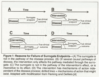 4. Fleming TR, DeMets DL: Surrogate end points in clinical trials: Are we being misled? Ann Intern Med 125:605-613, 1996.
