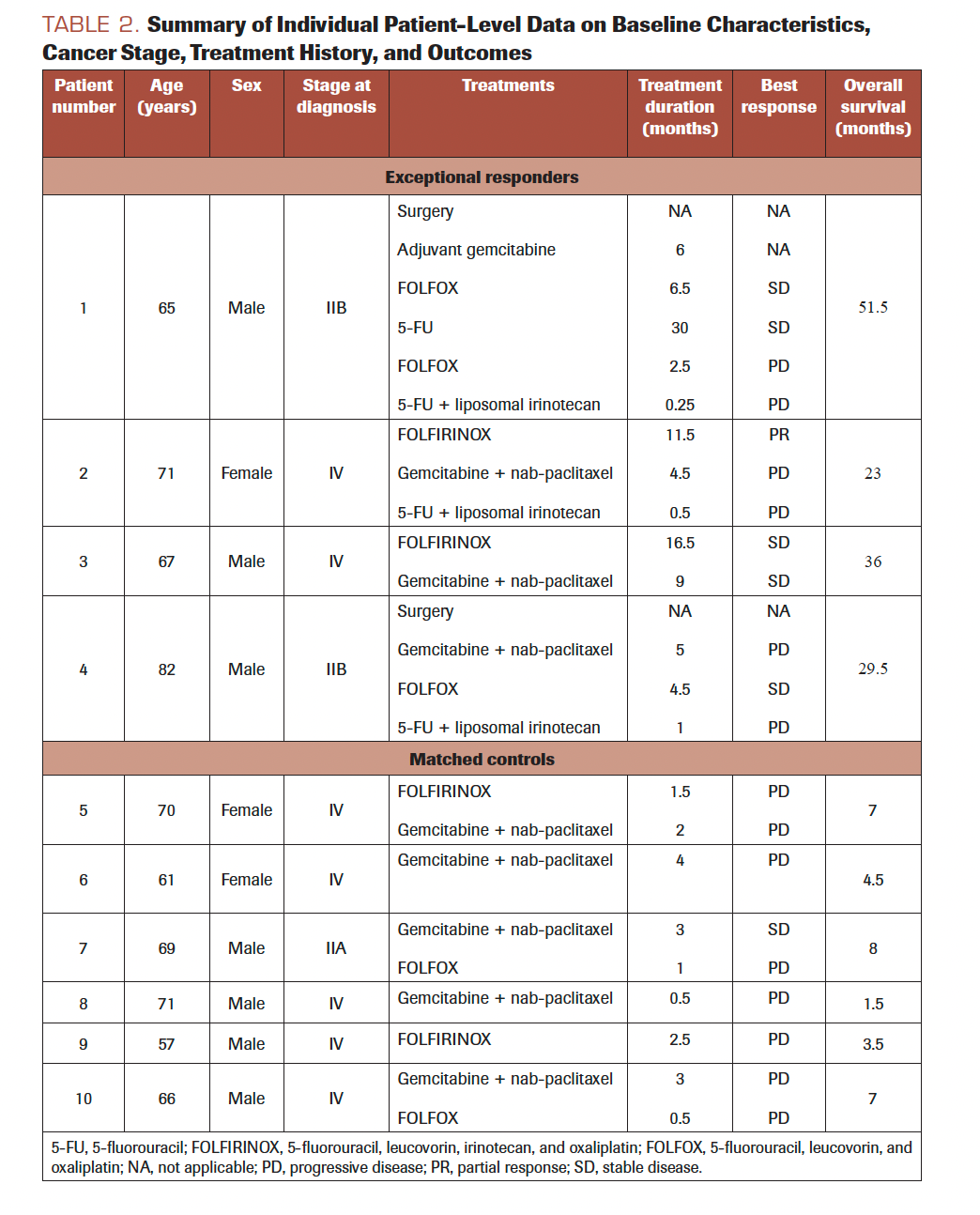 Pancreatic cancer is associated with poor outcomes at any stage. However, a very small number of patients—approximately 3% of those with metastatic disease—experience long-term survival through 5 years and durable responses to systemic therapy.1 The biological mechanisms that underlie the benefits observed with these exceptional