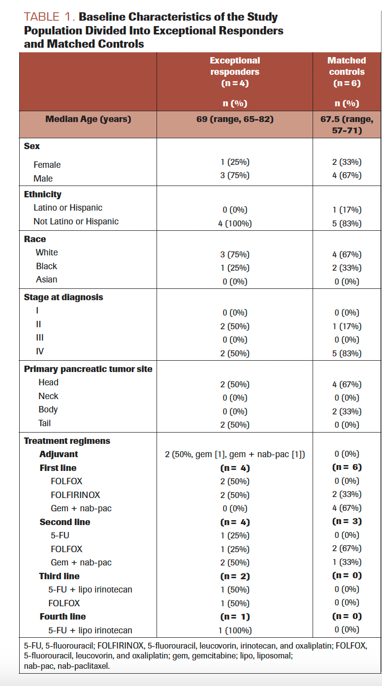 Both groups were well balanced in terms of age, sex, race, and first-line chemotherapy regimen. The median ages for exceptional responders and matched controls were 69.0 and 67.5 years, respectively. Both exceptional responders and matched controls were predominantly men (75% vs 67%, respectively) and predominantly White (75% vs 67%, respectively). Half of the exceptional responders had pancreatic tail primary tumors, compared with none of the matched controls. These data are summarized in Table 1.