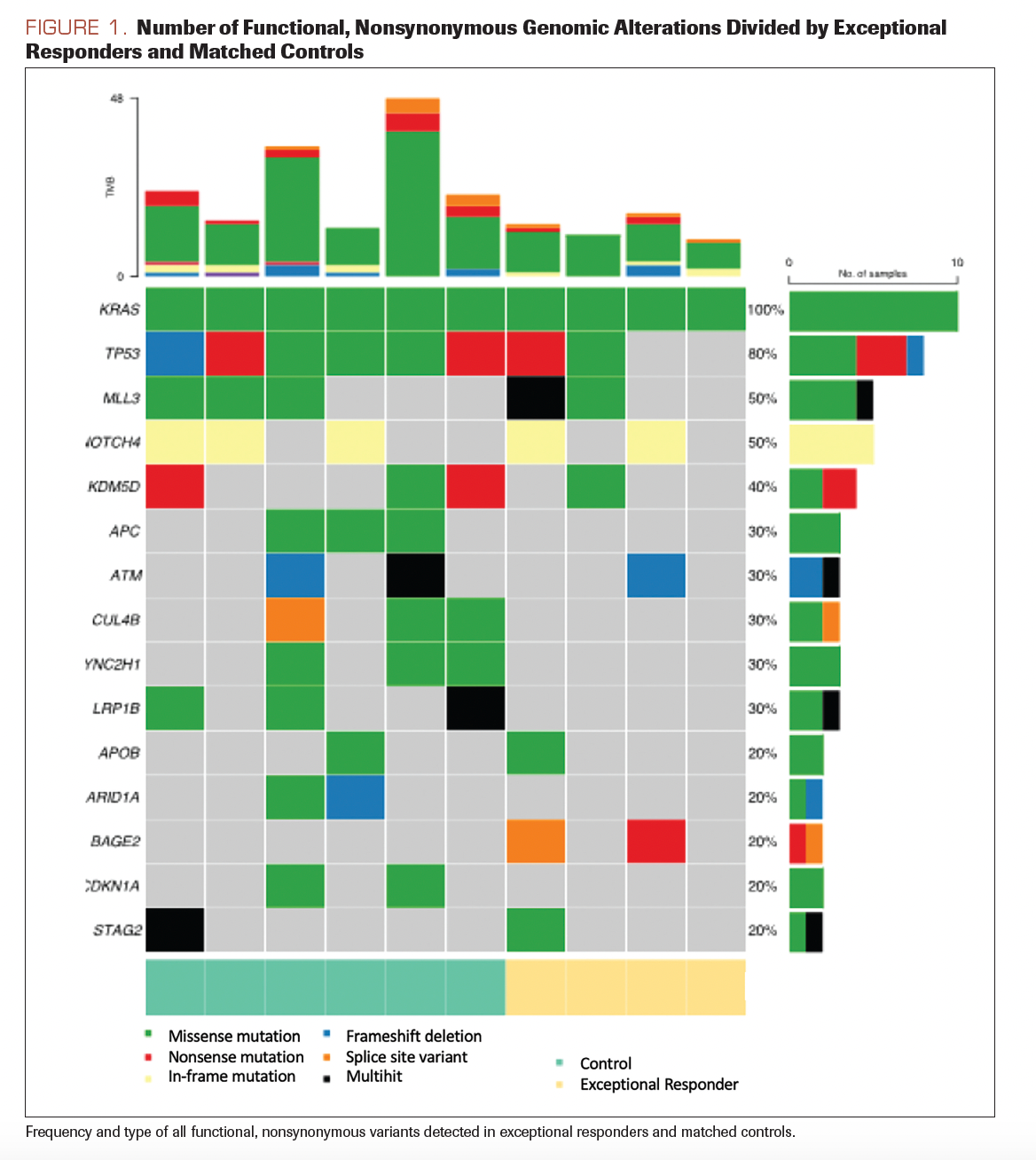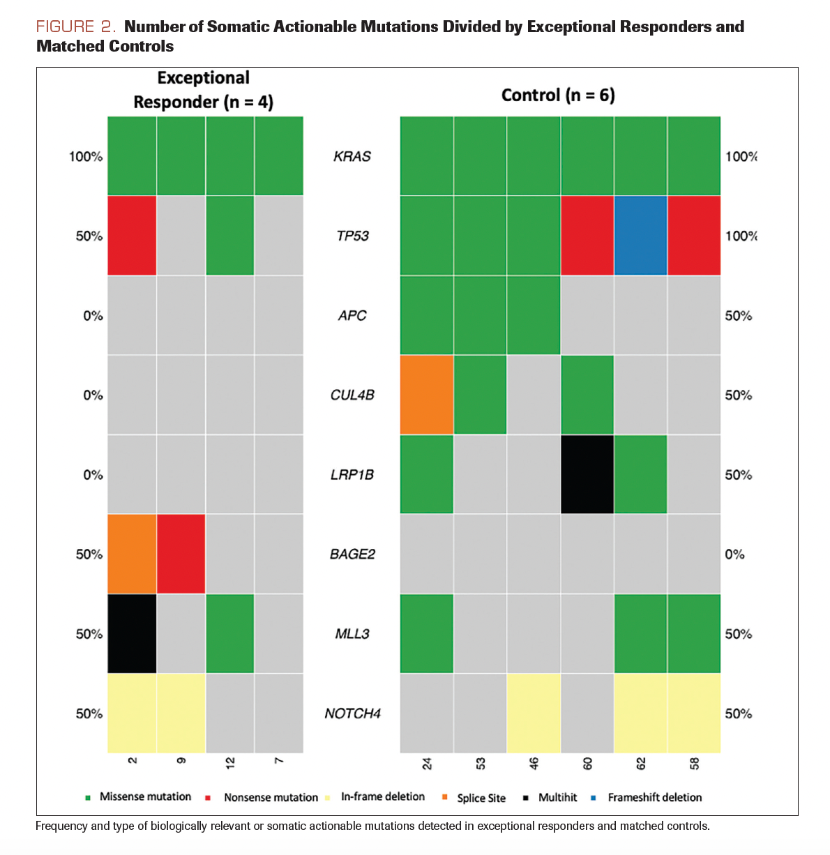 A total of 208 functional, nonsynonymous variants were detected in the study population, 52 in the exceptional responders and 156 in the matched controls. The genes with alterations and the types of variants detected are shown in Figure 1. Focusing on biologically relevant or somatic actionable mutations, 40 mutations were detected in the study population: 9 in the exceptional responders and 31 in the matched controls. Missense mutations in KRASwere present in 100% of exceptional responders and matched controls. Of the exceptional responders, 50% had alterations in BAGE2 vs 0% of the matched controls. Conversely, 50% of the matched controls had alterations in LRP1B, CUL4B, or APC vs 0% of the exceptional responders. These data are summarized in Figure 2.