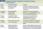 Studies of this type are listed in Table 3. GIS has typically been used to evaluate cancer-screening patterns across geographic regions; for example, GIS software has been utilized to investigate potential determinants of varying mammography and colonoscopy rates across the country.[18-20] Another potential avenue GIS software could explore is the relationship between geography and oncology treatment. An interesting study by Anthas et al highlights the ability of GIS to illustrate potential variations in treatment that are associated with geography. The authors found an inverse relationship between travel distance to a radiation therapy center and receipt of radiation therapy following breast-conserving surgery.[21] Along with the varying opinions concerning which treatment modality is the most appropriate for a given oncologic situation, it is important to evaluate the extent to which geography plays a role in clinical decision making.
