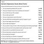 One tool used to assess for depression in older individuals is the Geriatric Depression Scale (GDS).[45] The short version consists of 15 yes/no questions (Table 4).[45] Scoring more than five answers indicative of depressive symptoms is considered a positive screen.[46] The characteristics of a two-question case-finding instrument that asks about depressed mood and anhedonia has been shown to be as effective a screening instrument as some longer instruments.[47]