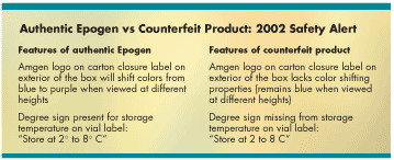 Amgen and Johnson & Johnson, manufacturers of Epogen and Procrit, respectively, issued warning letters to health care professionals describing counterfeit "uplabeled" vials and included the suspected lot numbers for the counterfeit vials it had located, pictures of the counterfeit labels, and descriptions of how the counterfeit products' labeling and packaging differed from those of the real product (see Table).