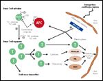 In phase two, donor T cells recognize alloantigens on host APCs. These activated T cells then proliferate, differentiate into effector cells, and secrete cytokines, particularly interferon-gamma (IFN-γ). These cytokines then support and drive the proliferation of donor T cells responding to the host antigens. The greater the immunologic disparity between the donor and recipient, the greater the T-cell response. The inflammatory cytokine cascade continues with subsets of T lymphocytes; T helper-1 lymphocytes also produce proinflammatory cytokines, including IL-12, interleukin-2 (IL-2), and interferon-γ. Additionally cytotoxic T lymphocytes and natural killer cells respond and stimulate monocytes to produce IL-1 and TNF-α, resulting in direct tissue damage of the skin and gut.[12,16]