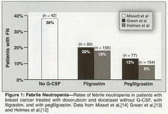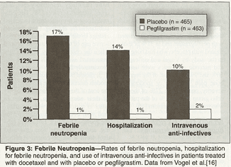 The approval by the FDA of pegfilgrastim for prevention of CIN was based on the results of two large randomized controlled trials in patients with breast cancer who were treated with doxorubicin and docetaxel (Taxotere),[12,13] a regimen that is associated with an FN rate of 38% in patients with breast cancer when it is used without growth factors.[14]