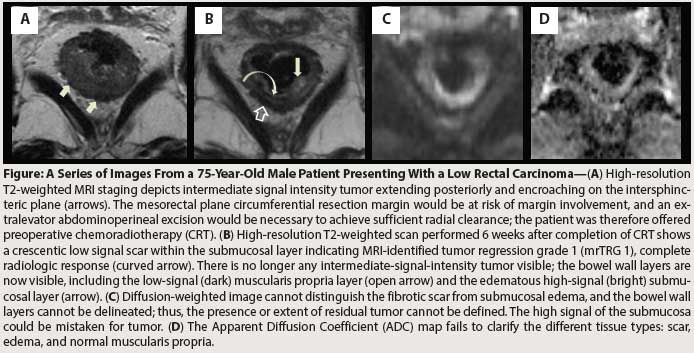Glynne-Jones and colleagues offer a clear evidence-based review of rectal cancer management. This review addresses four topical areas: patient selection, prognostic factors, the perceived limitations of MRI, and whether there is a role for functional imaging.[1] The authors propose that current policies regarding the use of chemoradiotherapy (CRT) or short-course preoperative radiotherapy (SCPRT) have resulted in an approach to rectal cancer management that often represents overtreatment, with significant loss of quality of life for patients. In the post–total mesorectal excision (TME) era, a number of practice-changing trials, such as the German-led randomized controlled trial (Sauer et al) and the Medical Research Council (MRC) CR07 and National Cancer Institute of Canada Clinical Trials Group C016 trial, supported the use of preoperative therapy.[2,3] These trials shaped current guidelines, but their selection criteria for preoperative therapy were relatively indiscriminant. Consequently, there has been a low threshold for CRT and SCPRT in clinical practice.