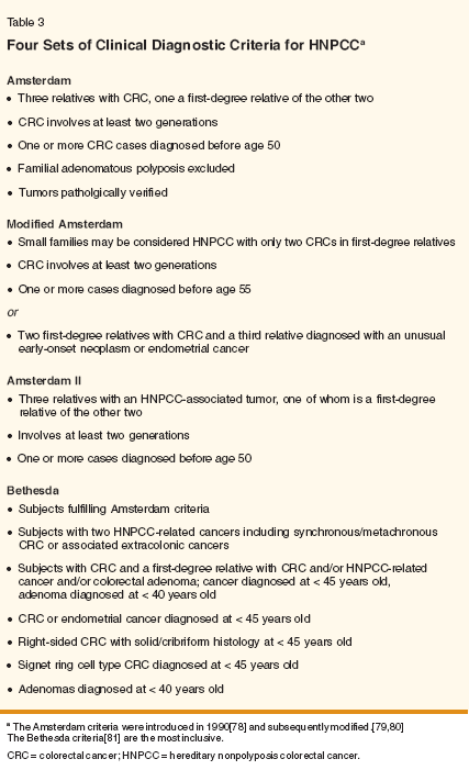 76. Syngal S, Fox EA, Eng C, et al: Sensitivity and specificity of clinical criteria for hereditary non-polyposis colorectal cancer associated mutations in MSH2 and MLH1. J Med Genet 37:641-645, 2000.