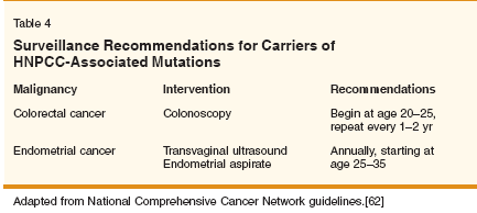 77. Burke W, Petersen G, Lynch P, et al: Recommendations for follow-up care of individuals with an inherited predisposition to cancer. I. Hereditary nonpolyposis colon cancer. Cancer Genetics Studies Consortium. JAMA 277:915-919, 1997.