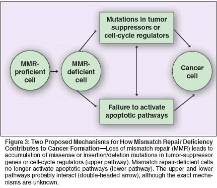 Patients with double primary malignancies of the colon and endometrium are another subgroup at-risk for inherited cancer susceptibility. In a study of 40 unrelated women with colorectal cancer and endometrial cancer, 7 patients had MLH1 or MSH2 mutations and 6 of the 7 had family histories suggestive of HNPCC. The relative risk of colorectal cancer in first-degree relatives of patients who carried germline mutations in MLH1 or MSH2 was 8.1 (95% CI = 3.5- 15.9) and the relative risk of endometrial cancer was 23.8 (95% CI = 6.4-61.0). First-degree relatives of patients with double primary malignancies without MLH1 or MSH2 defects were also at increased risk for colorectal cancer or endometrial cancer, with a relative risk of 2.8 (95% CI = 1.7-4.5) and 5.4 (95% CI = 2.0- 11.7), respectively.[41] Another study of women diagnosed with both colon and endometrial cancer (N = 80) revealed that the relative risk of colorectal cancer before age 55 in first-degree relatives of probands who had both cancers before age 55 was 30.5 (95% CI = 18.8-46.6).[43] In addition to clinical factors (early- onset disease and double primary malignancies), loss of mismatch repair in endometrial tumors can be helpful in identifying women with genetic susceptibility. A molecular phenotype (MSI-positive, MLH1-unmethylated) has been identified that appears to highlight carriers of germline mismatch repair mutations. Women with MSI-positive endometrial cancer without MLH1 methylation demonstrate familial clustering of malignancies, develop cancer almost 10 years earlier,[42] and have an excess of HNPCC-associated metachronous malignancies.[44] Clinical Significance of Mismatch Repair Deficiency