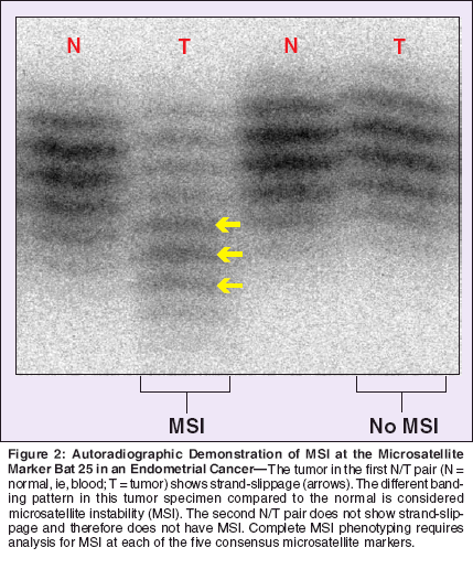 Identification of HNPCC patients is important because family members have been shown to benefit significantly from enrollment in colorectal cancer surveillance programs.[45] Whether the loss of mismatch repair in HNPCC-related or sporadic endometrial cancers is related to tumor behavior or overall survival, however, is controversial. In HNPCC-related endometrial cancers, no difference has been seen in 5-year cumulative survival (all stages) or in histologic subtype compared to age- and stage-matched sporadic endometrial cancers.[46] In a small study (109 tumor samples) that compared MSI-positive (N = 10 tumors with high-level MSI) to MSI-negative sporadic endometrial cancers, MSI positivity was associated with higher tumor grade and poor clinical outcome.[47] A larger retrospective study of sporadic MSI-positive and MSI-negative endometrial cancers, however, found no difference in 5-year survival, 5-year recurrencefree survival, stage, grade, or histologic subtype.[48] Another retrospective case/control study of 29 MSI-positive endometrial cancer patients demonstrated statistically significant improvement in 5- year survival (77% vs 48%) in a cohort of patients weighted heavily towards advanced-stage disease (> 50% of the patients had International Federation of Gynecology and Obstetrics [FIGO] stage III or IV disease).[49] This benefit was seen in univariate and multivariate analysis. An analysis of 70 MSI-positive vs 159 MSI-negative endometrial cancers (81% completely surgically staged) found that MSIpositive tumors tend to present with early-stage disease and have a less aggressive histology.[50] There were also no differences seen in recurrence or survival, but the median follow-up for both groups was only 24 months.