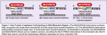 This review will discuss the molecular basis of HNPCC-related malignancies and will specifically focus on the clinical relevance of mismatch repair deficiency in sporadic and inherited forms of endometrial and ovarian cancer. Molecular Biology of Mismatch Repair Mismatch repair genes function to ensure fidelity of DNA replication in cell division. Replication errors can occur through mismatches produced by physical or chemical alteration of nucleotides, misincorporation of nu cleotides during replication, and genetic recombination events. There are now seven mismatch repair genes that have been investigated in cancers: MLH1, MSH2, MSH3, MSH6, PMS1, PMS2, and MLH3. Figure 1 illustrates how these proteins normally function as complexes to repair single-base mismatches or insertion/deletion type mutations. The fact that the majority of MSI-positive tumors have MLH1 or MSH2 defects supports the unique functionality of MLH1 and MSH2. The MSH2/MSH6 and MSH2/MSH3 heterodimers function as sensors, recognizing mismatched DNA, whereas the MLH1/PMS2 heterodimer initiates correction.[18]