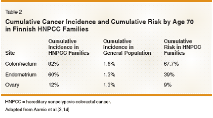Approximately 5% of all endometrial cancers result from inherited cancer susceptibility.[36] Of inherited endometrial cancers, an estimated 0.5% to 1.4%[5,6] are HNPCC-related. HNPCC is the best-understood inherited endometrial cancer susceptibility syndrome. Endometrial cancer is the most frequent extracolonic tumor in HNPCC,[2,3,17] and the cumulative lifetime risk of endometrial cancer in HNPCC families is high- approximately 40% to 60%.[3,14] Although the majority of germline mutations in HNPCC families are in MLH1 and MSH2,[8] families that carry germline mutations in MSH6 appear to have a preponderance of endometrial cancers regardless of whether or not they meet strict (Amsterdam) clinical criteria.[37,38] An analysis of 20 families with 146 MSH6 mutation carriers demonstrated an overall lower risk for all HNPCCrelated tumors but a significantly higher risk for endometrial cancer compared to MLH1 and MSH2 mutation carriers.[39]