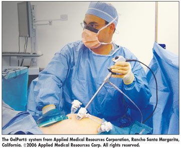 Manufactured by Applied Medical Resources Corporation, of Rancho Santa Margarita, California, the GelPort system consists of a rubber sleeve (wound protector) that passes through the abdominal wall and is attached at one end to a plastic ring, which rests on the outer surface of the patient's skin. An outer gel dome with a central opening is fitted onto the plastic ring, completing the seal.