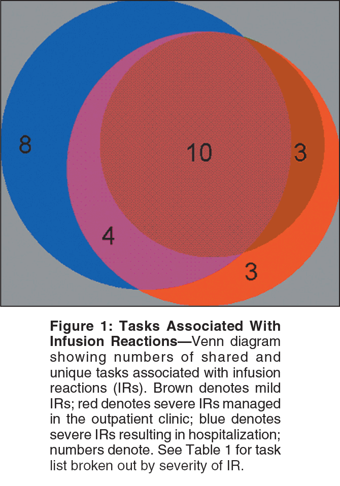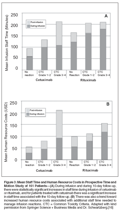 A study involving 416 health professionals and staff from 21 community oncology clinics systematically described the clinical tasks involved in the management of both mild and severe infusion reactions and enumerated the associated human resource costs.[14] Data were collected from a modified time and motion survey that identified tasks involved in the management of IRs and the associated human resource costs.