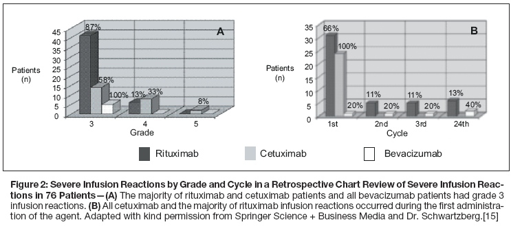 While the risk of developing an infusion reaction for patients administered MoAb therapy is well known by clinicians and nurses, there are few studies describing the prevention and management of IRs, particularly in the community oncology setting. A study conducted by Schwartzberg and colleagues reviewed 76 charts identified through electronic billing records, manual searches of medical records, and staff recall of patients experiencing severe IRs resulting from treatment with cetuximab, rituximab (Rituxan), or bevacizumab.[15] The definition of a severe IR was that described in the package insert for each agent (Rituxan package insert, 2008; Erbitux package insert, 2008; Avastin package insert, 2008). Chart data included patient demographics, IR management, and severity of IR. An oncologist and an oncology nurse reviewed all submitted chart data from the 19 community oncology centers.
