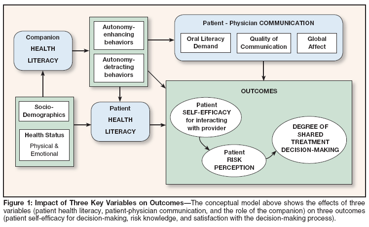 Older cancer patients are especially vulnerable to poor health literacy and suboptimal communication. There is a need for additional research looking at how health literacy, patient-physician communication, and the presence of companions interact to affect outcomes such as patient self-efficacy, risk communication, and shared decision-making. The conceptual model outlined in Figure 1 provides a broad framework with which to organize future research and locates promising areas for intervention. The issues are relevant not only to cancer patients making routine treatment decisions, but to those who are undergoing procedures or participating in clinical trials where informed consent of the older cancer patient is required.