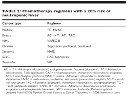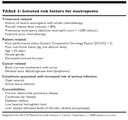 A recent update of the ASCO guidelines established the threshold for use of prophylactic growth factor at 20%. In addition, the NCCN guidelines have recommended CSFs be used in regimens with a 20% risk of neutropenic fever (Table 2). In addition, certain patient risk factors for neutropenia have been identified and should be considered in conjunction with the chemotherapy regimen (Table 3).