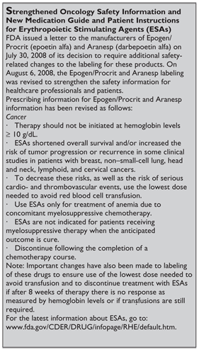 Recent reports of four new studies in patients with cancer found a higher chance of serious and life-threatening side effects and/or death with the use of erythropoiesis-stimulating agents (ESAs). These research studies evaluated unapproved dosing regimens; a patient population for which ESAs are not approved (patients not receiving concurrent chemotherapy); had target hemoglobin levels up to 15.5 g/dL; or focused on a new, unapproved ESA. Based on these data, the FDA issued a black box warning and updated the package labeling on all ESA products. Further, the prescribing information has been revised to clarify the FDA-approved conditions for use of erythropoiesis-stimulating agents (ESAs) in patients with cancer and revised directions for dosing to state the hemoglobin level (≥ 10 g/dL) at which treatment with an ESA should not be initiated. The new label states that ESAs are not indicated for patients receiving myelosuppressive therapy when the anticipated outcome is cure. In addition, the Center for Medicare Services (CMS) issued further restrictions on the use of these agents in oncology patients with Medicare. For more information and the most up-to-date announcements regarding use of ESAs in patients with cancer, see the box on safety earlier in this chapter and go to www.fda.gov/cder/drug/infopage/RHE/default.htm.