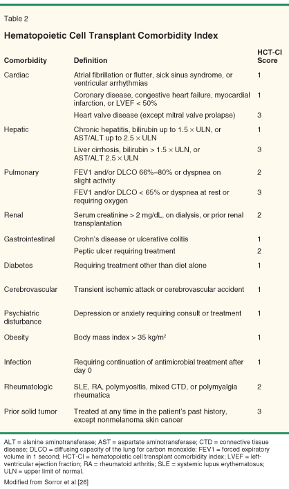 Comorbidities are common in older cancer patients. Several studies have documented their significant impact on treatment outcomes. A hematopoietic cell transplant comorbidity index (HCT-CI) has been developed based on the analysis of 1,055 patients (median age: 44.8 years; range: 0.8–72.7) receiving allogeneic transplants (see Table 2). For patients with low risk (score 0), the nonrelapse mortality at 2 years was 14% and the OS was 71%, compared to 21% and 60% in patients with intermediate risk (scores 1–2) and 41% and 34% in patients with high risk (score 3), respectively.[26]