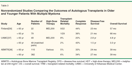 38. Reece DE, Bredeson C, Perez WS, et al: Autologous stem cell transplantation in multiple myeloma patients <60 vs >60 years of age. Bone Marrow Trasplant 32:1135-1143, 2003.