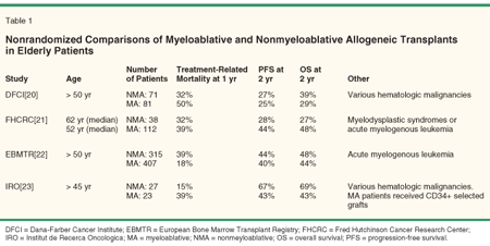 Table 1 summarizes several nonrandomized studies comparing nonmyeloablative/RIC transplants with myeloablative allogeneic HSC transplants in older patients.[20-23] In general, they demonstrate a significantly reduced transplant-related mortality without significant differences in outcomes (PFS and OS), despite the fact that nonmyeloablative patients were more frequently older and had high-risk disease.