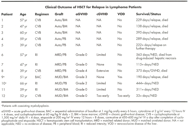 Eight patients received a myeloablative conditioning regimen; four othersreceived a reduced-intensity regimen consisting of fludarabine (Fludara),busulfan (Myleran), tacrolimus (Prograf), mycophenolate mofetil (CellCept), and4 Gy of total lymphoid radiation. Five patients received autologous HSCT: threemarrow and two peripheral blood stem cells. Among seven allogeneic transplants,three received matched related peripheral blood stem cells and four receivedmatched unrelated marrow (n = 3) or peripheral blood (n = 1) stem cells.Allogeneic recipients received tacrolimus and methotrexate for graft-vs-hostdisease prophylaxis. Clinical outcome is summarized in the table below: