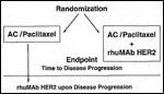 Results from the phase II studies and the activity of rhuMoAb HER2 against xenografts when given in combination with doxorubicin and paclitaxel have been encouraging. These positive results have led to the design of a phase III multinational study of chemotherapy in combination with rhuMoAb HER2 in patients with HER2-overexpressing breast tumors who have not received prior chemotherapy for metastatic disease (Figure 2). In addition to proven HER2 overexpression by immunohistochemistry, eligible patients must have measurable disease and must not have received prior chemotherapy for metastatic disease.