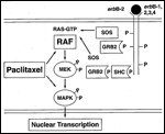 The mitogen-stimulated protein serine/threonine kinase c-raf-1 functions as a central component of the mitogen-activated protein kinase (MAP kinase) signal transduction pathway.[33] In MCF-7 breast cancer cells, paclitaxel treatment leads to activation of c-raf-1, documented by a reduced c-raf-1 electrophoretic mobility after paclitaxel exposure.[30] Furthermore, paclitaxel therapy induces a dose- and time-dependent accumulation of the cyclin inhibitor of p21WAF1, and c-raf-1 depletion prevents this activation. In addition to c-raf-1 activation, tyrosine phosphorylation of MAP kinase is a well-documented response to paclitaxel, and it probably represents a functionally important event by the agent.[30,32]