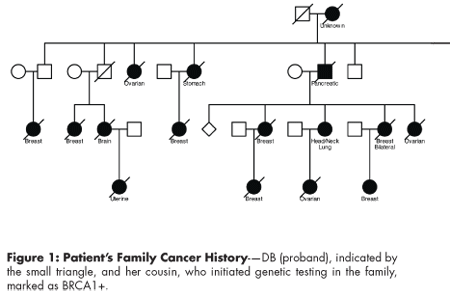 The patient, DB, is a 51-year-old white, married female with a strong family history of breast cancer. She presented for high-risk assessment and genetic testing following the discovery of a deleterious mutation in a family member.