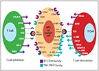 The generation of antitumor immune response by T lymphocytes is a complex multi-step process that is modulated by several signals. Primary signal requires that antigen be presented by antigen-presenting cells (APCs) in the context of self–human leukocyte antigen (HLA) molecules-for recognition by T cells. HLA class I molecules present antigens to CD8+ T lymphocytes, and class II molecules present antigens to CD4+ T lymphocytes. CD4+ T helper cells subsequently produce a number of cytokines, including interleukin-2 (IL-2), that can propagate the immune response (Figure A). IL-2, a nonspecific T-cell growth factor, can result in the expansion of all T-cell subsets, including T-cytotoxic, helper, and regulatory cells. After initial recognition of the antigen, the T-cell function is modified by complex interactions between co-stimulatory or co-inhibitory proteins and their ligands expressed on the APCs (or in some cases tumor cells) and on the T cells; these interactions constitute the secondary regulatory signal that fine-tunes the immune response. A number of immune-modulatory proteins, termed checkpoints, have been identified; the list continues to expand as we get better insights into the anatomy of the immune response; some of these checkpoints are illustrated in Figure 1. Most of these proteins belong to the immunoglobulin superfamily or to the tumor necrosis factor (TNF)/TNF receptor (TNFR) family. While not inherently active, these regulatory molecules exert their effect via the recruitment of TNFR-associated factor (TRAF) adapter proteins. Cytotoxic T lymphocyte antigen 4 (CTLA-4) and programmed death protein 1 (PD-1) have been targeted successfully in cancer immunotherapy; several other checkpoints are under active investigation.