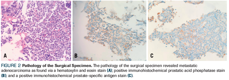 This 49-year-old, otherwise healthy, man presented with high-volume metastatic hormone-sensitive prostate cancer. In addition to bulky retroperitoneal lymphadenopathy, his widespread osteolytic bony metastatic disease was concerning for early spinal cord compression, the signs and symptoms of which occurred soon after his hospitalization. Blood work revealed early findings of DIC. While bulky retroperitoneal lymphadenopathy and lytic bone metastases made the initial differential diagnosis challenging, the early finding in his blood work of a very high PSA level of 8,972 ng/mL led to a quick diagnosis of metastatic prostate cancer. This diagnosis was later confirmed by the pathology of the surgical specimen (Figure 2).