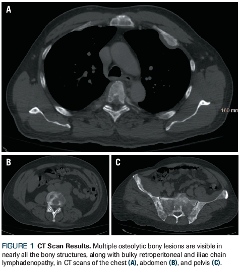 Of note, this patient presented with diffuse osteolytic metastases. A widely metastatic osteolytic presentation as in this case requires a thorough evaluation to rule out other malignancies, including multiple myeloma, lymphoma, and solid tumors such as urothelial cancer or breast cancer. An early diagnosis based on a highly elevated PSA level is very helpful. Recent research studies have focused on the pathogenesis of bone metastases to identify potential targets for therapeutic interventions. Metastatic tumor cells from various cancers in the bone dysregulate the coordinated relationship between osteoclastic and osteoblastic functions, promoting tumor cell proliferation while causing bone destruction aided by various cytokines and growth factors. The pathologic dominance of different cytokines determines the common radiographic pattern of bone lesions, which may vary from predominantly osteolytic, as commonly seen in breast cancer and multiple myeloma, to predominantly osteoblastic, as commonly seen in prostate cancer. On radiographs, the bone metastases from prostate cancer typically have the characteristic osteoblastic appearance.